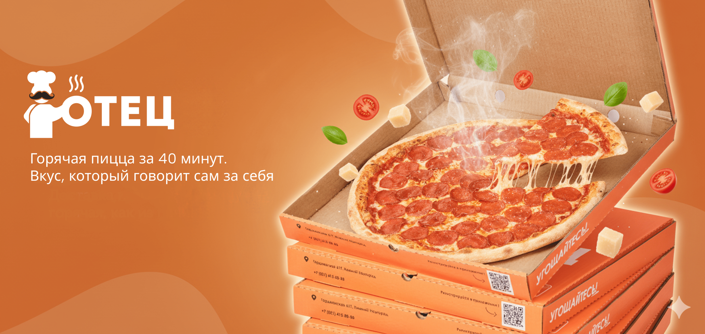 Пиццерия "Отец" готовит для вас пиццу из натуральных продуктов в Нижнем Новгороде! Только свежие ингредиенты, ручная раскатка теста и щедрые порции. Закажите доставку за 40 минут или оформите самовывоз. Акции для новых клиентов - 1000 баллов за регистрацию и заполнение профиля; 1+1=3 (Закажи две пиццы и третью получи в подарок. *В подарок идет пицца по наименьшей стоимости.); скидка 30% на самовывоз.