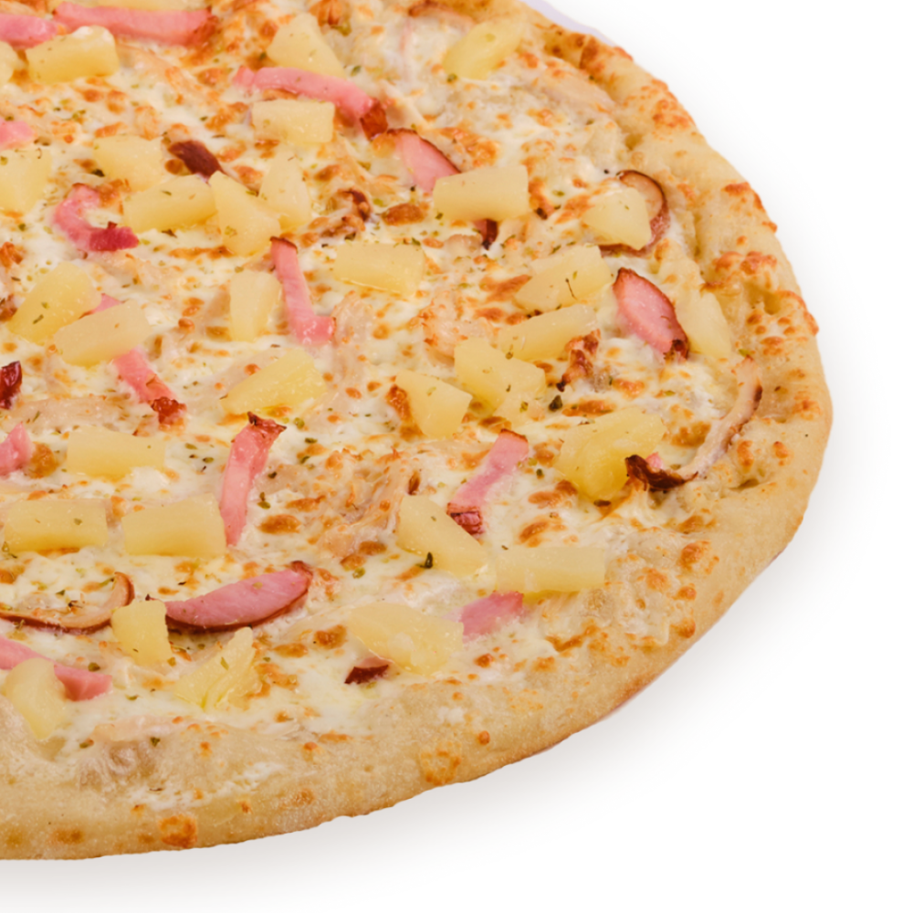 соус сливочный, ветчина, куриное филе, моцарелла, ананасы, чесночное масло, орегано