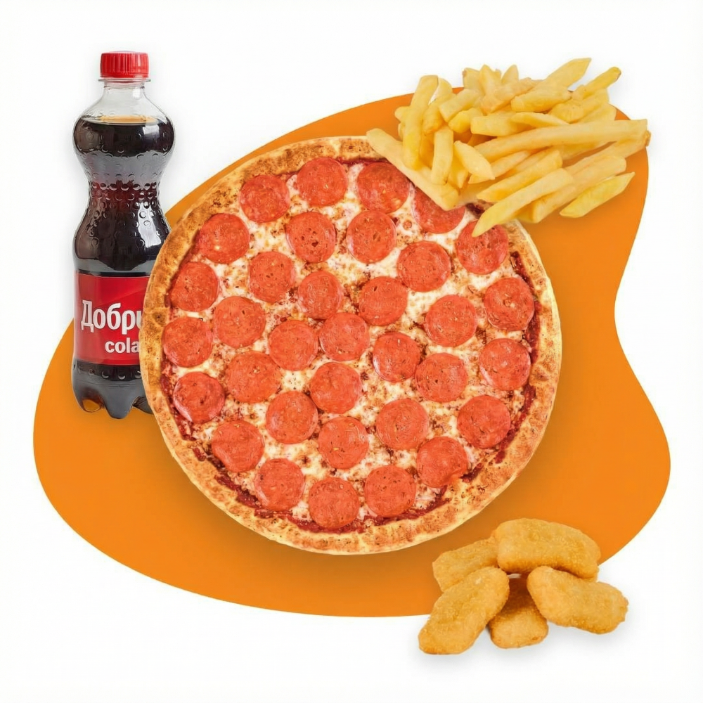 Пицца пеперони 25см, картофель фри средний, наггетсы 4шт, напиток 0.5л на выбор