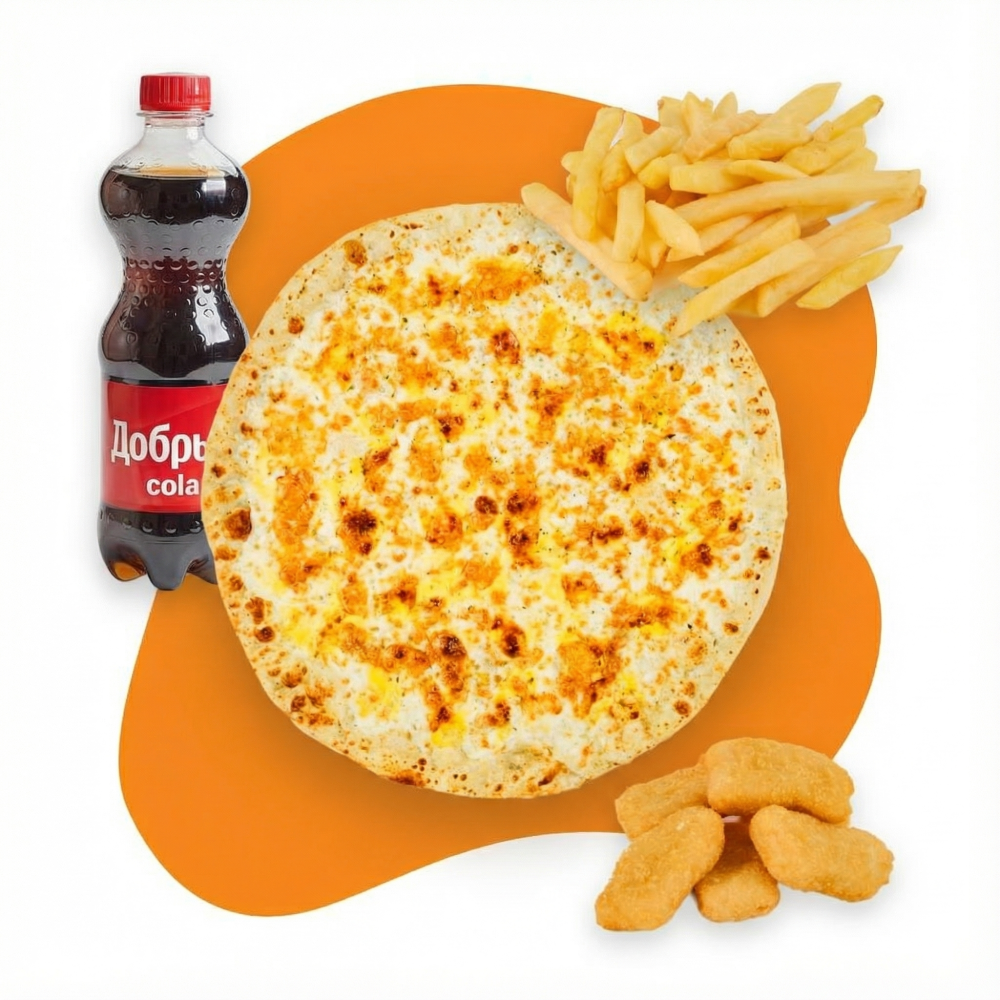 Пицца 4 сыра 25см, картофель фри средний, наггетсы 4шт, напиток 0.5л на выбор