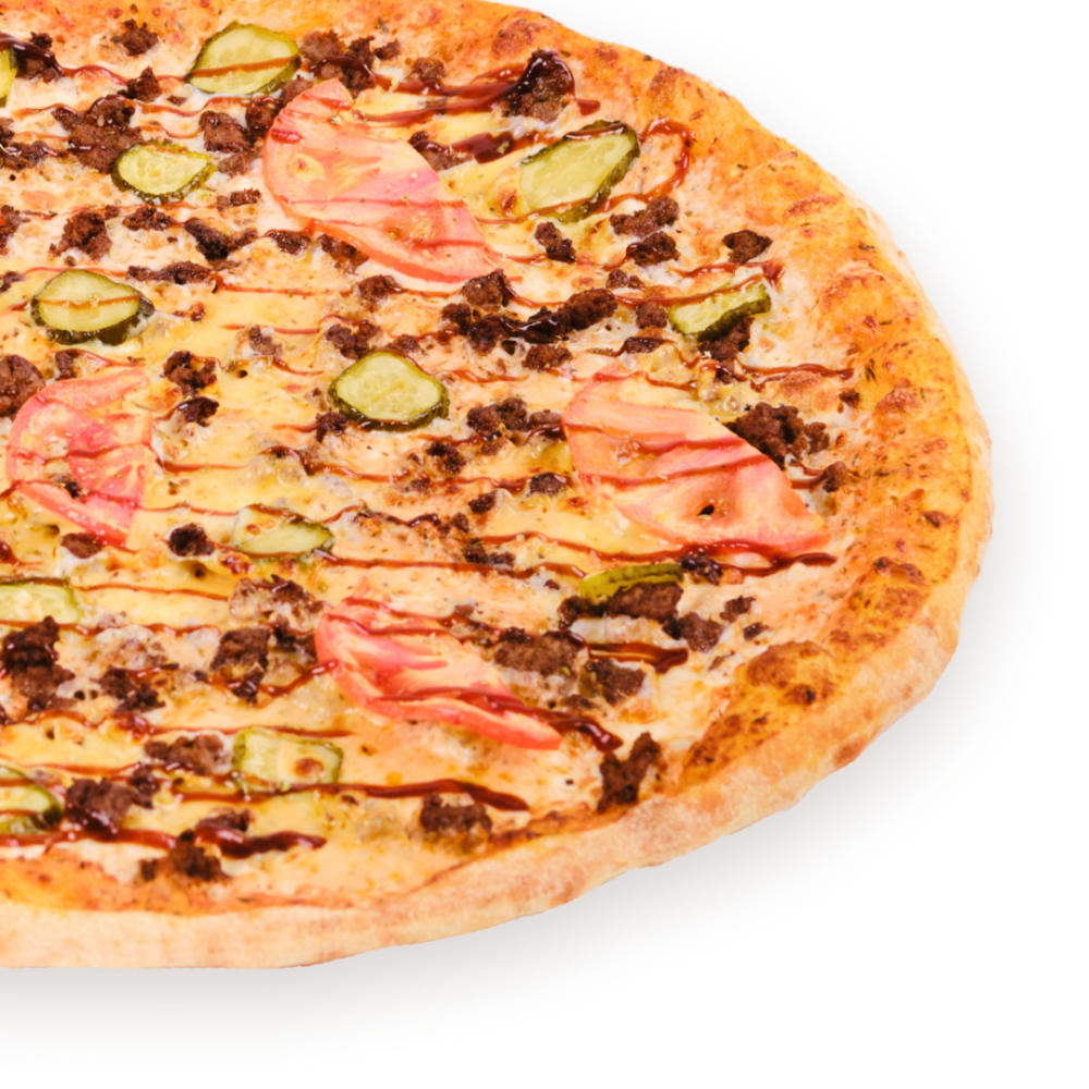 соус сливочно-томатный, чеддер, моцарелла, фарш говяжий, томаты, корнишоны, соус BBQ, чесночное масло, орегано