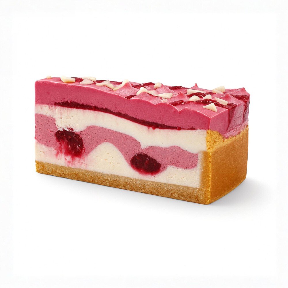 Сочетание творожного сыра с прослойкой с малиновой муссой и малиновым пюре на песочной подложке.