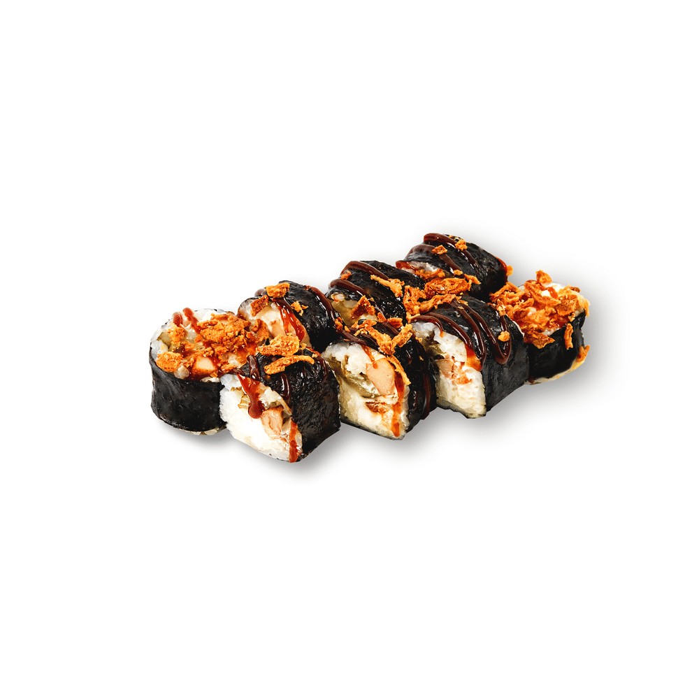 Рис, нори, сыр творожный, курица-терияки, маринованные огурцы, горчично-медовый соус, соус BBQ, жаренный лук. Васаби, имбирь, соевый соус в комплекте.