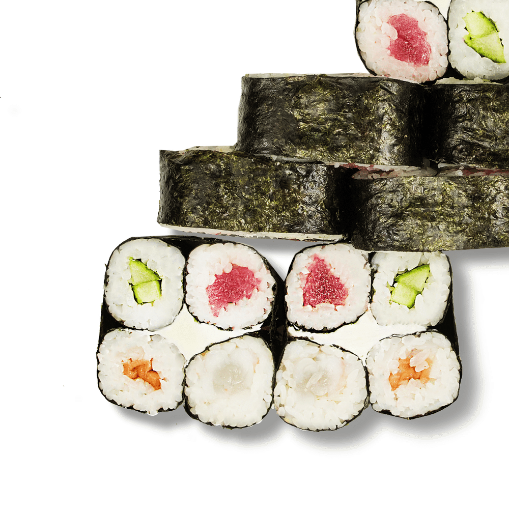 Ролл с тунцом, ролл с огурцом, ролл лососем, ролл с креветкой. Васаби, имбирь, соевый соус в комплекте(х2).